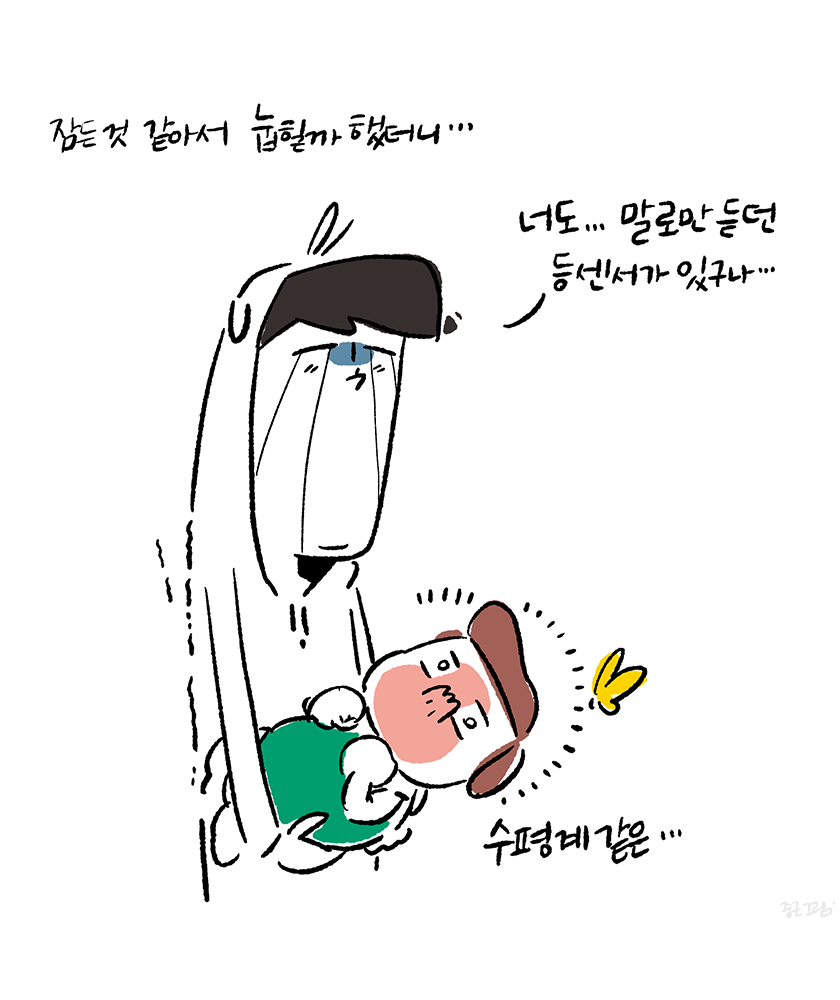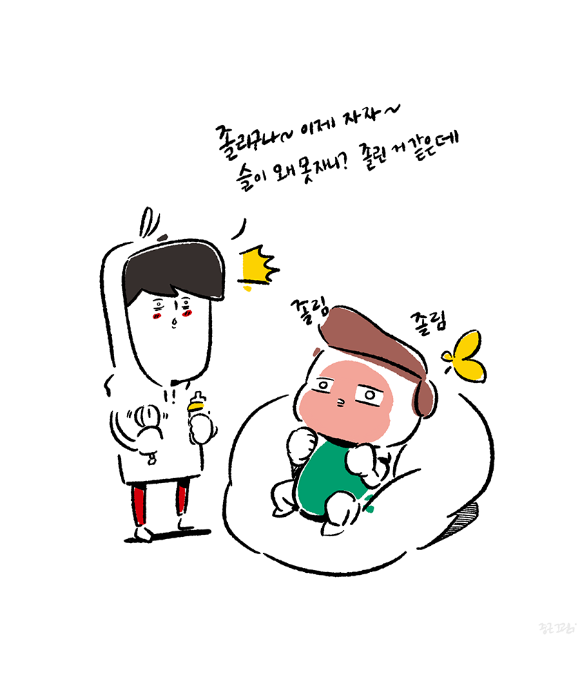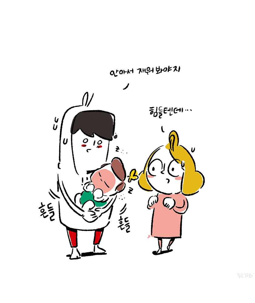 육아휴직 중에 최대한 육아에 참여하려고 낮동안 아내를 쉬게 하고 슬이를 보려고 애썼다. 먹고 자고 싸는 것만으로도 박수 받는 존재가 낮에 자는 것을 상당히 어려워했다. 잠이 몰아치는 기분에 싫증도 내고 짜증도 내면서 잠은 자려고 하지 않았다. 잠을 자보라며 바닥에 뉘여놓는 것도 싫고 역류 방지 쿠션 위에서 누워 잠드는 것도 싫고, 그렇다고 낮부터 스와들업 입히기는 너무 답답해 보여서 내가 싫었다. 안아서 둥가둥가 해주다보면 잠 들듯 안드는 묘한 긴장 상태를 유지하는 것 같았다. 잠이 오면 폭~ 기대서 자면 되는데 힘도 별로 없는 녀석이 낑낑대며 기대려고 들지는 않았다. 신뢰의 문제인지 편안함의 문제인지 고민은 됐지만 어떻게 해결할 방법은 없었다. 아기를 재워서 눕히려고 들면 아기 몸에 있는 수평계가 몸이 누워지는 것을 체크하여 '당장기상' 시키는 등센서가 작동하는 것 같다. 육아에서 이 부분이 상당히 곤혹스러웠다. 무거운 것은 둘째치고 안고 있는 동안 거의 모든 행동에 제약이 따르다 보니 할 수 있는 것이라고는 멍하니 라디오를 듣는 것이었다. 덕분에 뉴스 듣는 취미는 생겼다. 아기를 재우려 안고 누워보기도 하고 따로 눕혀 보기도 하고 엄마가 재워보기도 하고 이런저런 방법을 나름 강구해봤다. 아직 수면에 대해서 본능적으로 순응해야 하는 것인지도 잘 모르기에 그런 것 같았다. 결국 시간이 지나면 나아지겠지만 부모가 조금이라도 도와줌으로 해서 아기가 배우고 학습해야 되는 부분으로 만들어야겠다는 생각을 했다. 천천히 알려줘보자... 라고 생각했지만 어떻게? 라고 반문하면 답할 수 없는 질문이었다. 그래도 잠은 누워서 자야 잘 잔다~ 이 한가지 육아철학으로 낮잠 밤잠을 재워봐야겠다.