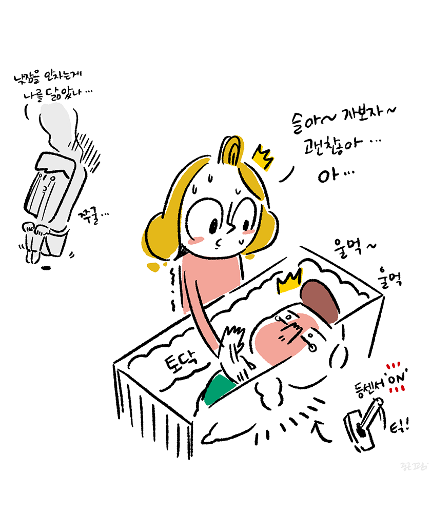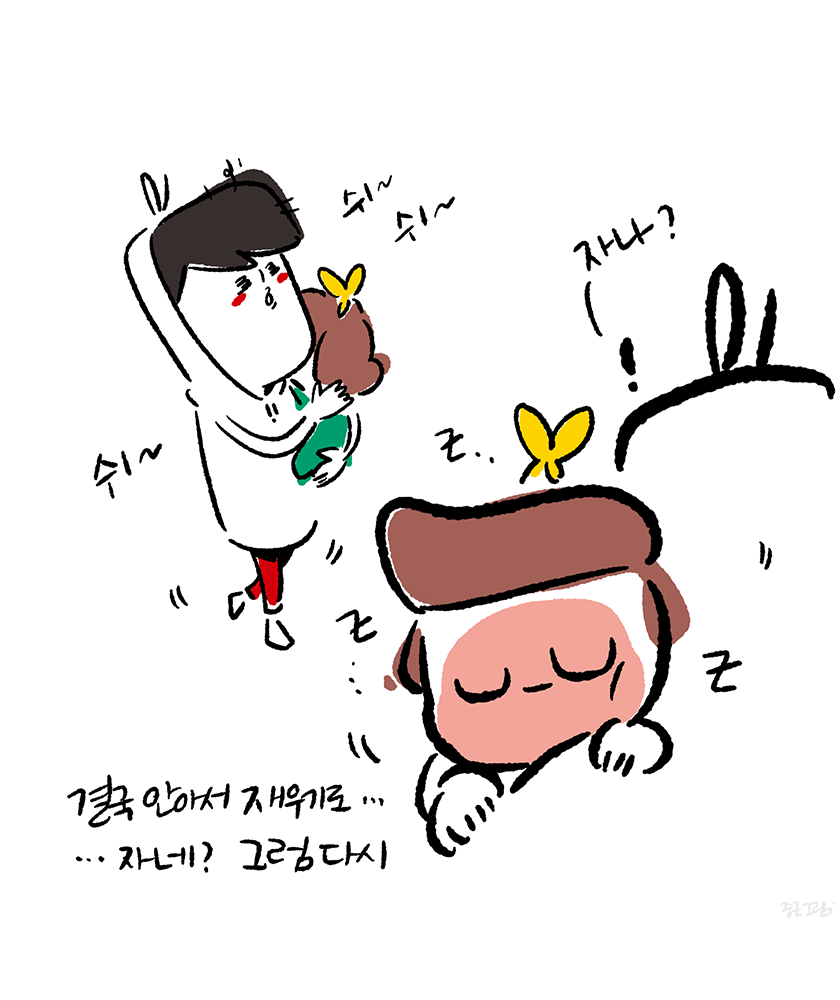 육아휴직 중에 최대한 육아에 참여하려고 낮동안 아내를 쉬게 하고 슬이를 보려고 애썼다. 먹고 자고 싸는 것만으로도 박수 받는 존재가 낮에 자는 것을 상당히 어려워했다. 잠이 몰아치는 기분에 싫증도 내고 짜증도 내면서 잠은 자려고 하지 않았다. 잠을 자보라며 바닥에 뉘여놓는 것도 싫고 역류 방지 쿠션 위에서 누워 잠드는 것도 싫고, 그렇다고 낮부터 스와들업 입히기는 너무 답답해 보여서 내가 싫었다. 안아서 둥가둥가 해주다보면 잠 들듯 안드는 묘한 긴장 상태를 유지하는 것 같았다. 잠이 오면 폭~ 기대서 자면 되는데 힘도 별로 없는 녀석이 낑낑대며 기대려고 들지는 않았다. 신뢰의 문제인지 편안함의 문제인지 고민은 됐지만 어떻게 해결할 방법은 없었다. 아기를 재워서 눕히려고 들면 아기 몸에 있는 수평계가 몸이 누워지는 것을 체크하여 '당장기상' 시키는 등센서가 작동하는 것 같다. 육아에서 이 부분이 상당히 곤혹스러웠다. 무거운 것은 둘째치고 안고 있는 동안 거의 모든 행동에 제약이 따르다 보니 할 수 있는 것이라고는 멍하니 라디오를 듣는 것이었다. 덕분에 뉴스 듣는 취미는 생겼다. 아기를 재우려 안고 누워보기도 하고 따로 눕혀 보기도 하고 엄마가 재워보기도 하고 이런저런 방법을 나름 강구해봤다. 아직 수면에 대해서 본능적으로 순응해야 하는 것인지도 잘 모르기에 그런 것 같았다. 결국 시간이 지나면 나아지겠지만 부모가 조금이라도 도와줌으로 해서 아기가 배우고 학습해야 되는 부분으로 만들어야겠다는 생각을 했다. 천천히 알려줘보자... 라고 생각했지만 어떻게? 라고 반문하면 답할 수 없는 질문이었다. 그래도 잠은 누워서 자야 잘 잔다~ 이 한가지 육아철학으로 낮잠 밤잠을 재워봐야겠다.