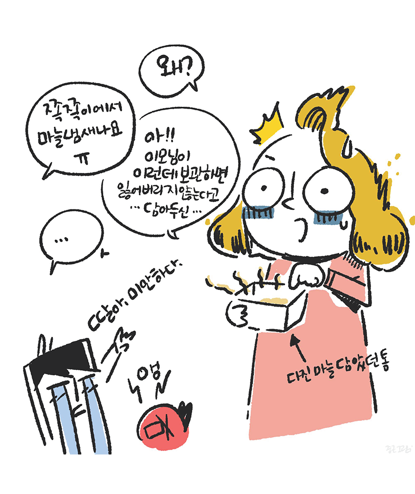 쪽쪽이를 사용할지 말지 때문에도 아내와 미묘한 갈등이 있었다. 아내는 아기가 쪽쪽이에 많이 의지하게 될까봐 좀 더 늦게 사용하고 싶어했다. 반대로 나는 우리가 주지 못하는 안정감을 줄 수 있을 것 같아 좀 써보면 안될까? 였다. 아기를 재우려고 눕혀놓으면 낑낑거리며 불편해 하는 것을 잘 달래지 못했던 그 시절 결국 우리 부부는 쪽쪽이를 써보기로 했다. 빨려는 욕구가 있어서인지 쪽쪽이를 빨고 있으면 칭얼거림이 줄어드는 것 같았다. 쪽쪽이(공갈 젖꼭지)를 며칠 쓰다보니 씻어놓고 살균건조하고 또 사용하고 2~3개를 가지고 번갈아가며 아기에게 물렸었다. 별도의 보관 케이스도 없었기에 살균기 안에 없으면 서로 물어보고 찾아야했다. 그렇게 쪽쪽이를 며칠 물리던 사건의 날(?), 여느 날과 마찬가지로 아빠를 까먹지 않았는지 인사를 하고 씻기고 분유를 먹이면서 우리 가족의 하루를 정리하고 있었다. 반복되는 삶에서 아기 역시 자기 몫을 하고 있었다. 찡찡거리며 칭얼거리는 것이었다. 나는 또 쪽쪽이를 찾았고 아내는 쪽쪽이가 담겨있는 통에서 꺼내 주었다. 쪽쪽이를 바로 아기에게 물렸는데 뭐가 맘에 안드는지 바로 뱉어내고 표정도 얼마없는 아이가 이상한 표정을 짓는 게 아닌가. 또 물려봐도 또 인상을 부리며 뱉어내었다. 왤까 싶어서 쪽쪽이를 집어 드는 데 마늘 냄새가 스멀스멀 올라오는 것이 아닌가. 그제 서야 우리는 쪽쪽이를 담아두는 통의 원래 용도를 기억해냈다. 다진 마늘을 담아두던 통이었는데 낮에 집안 일을 좀 봐주시던 산후도우미 이모님께서 아기 젖병 세척 후에 비어있던 통에 쪽쪽이를 넣어두시고 '여기 모아두면 편해요'라고 하셨던 것 같다. 모두의 불찰로 슬이는 생애 처음으로 매운맛을 보게 된 것이다. 딸아 이건 절대적으로 사고였단다. 소를 또 잃어 봤으니 우리는 외양간을 수리했다. 사용 후의 빈통이라도 통을 용도별로 좀 분류해서 보관하는 것이다. 교훈+1