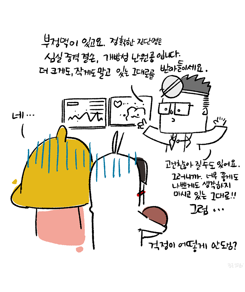 병원에 있다보니 아파서 온 아이들이 무척 많았고 심각해 보이는 아이들도 있어서 좀 무섭기도 했다. 오래 아프면 안될텐데... 라는 생각이 컸다. 그렇게 기다리고 있다가 보니 아이 엄마를 부르는 소리에 의사방으로 들어갔다. 의사는 차분하고 냉랭한 어조로 말했다. 부정맥이 있는 것이 맞고 심장에 구멍이 크게 나있다고 했다. '심실중격결손', '개방성난원공'이 있다고 했다. 그러면서 심장 구멍중에 바깥쪽에 있는 것은 대부분 막히니까 걱정이 안해도 될 것 같은데 가운데는 좀 두고 봐야 한다고 했다. 막힐 수도 있고 아닐 수도 있고 그것은 전적으로 아이한테 달려 있다고 했다. 그러면서도 상황을 있는 그대로 바라봐야한다고 했다. 너무 낙관적이지도 비관적이지도 않게 아이에게 문제가 있는 것은 사실이고 좋아 질수도 있고 아닐 수도 있으니까. 어떻게 걱정을 안할 수가 있지? 라는 생각과 함께 속으로 물었다. 그러면서도 위안이 되는 말이기도 했다. 그렇게 생각하지 않으면 한 없이 부정적인 상상의 늪에 빠질 수 있으니 그러지 말라는 것 같기도 했으니...