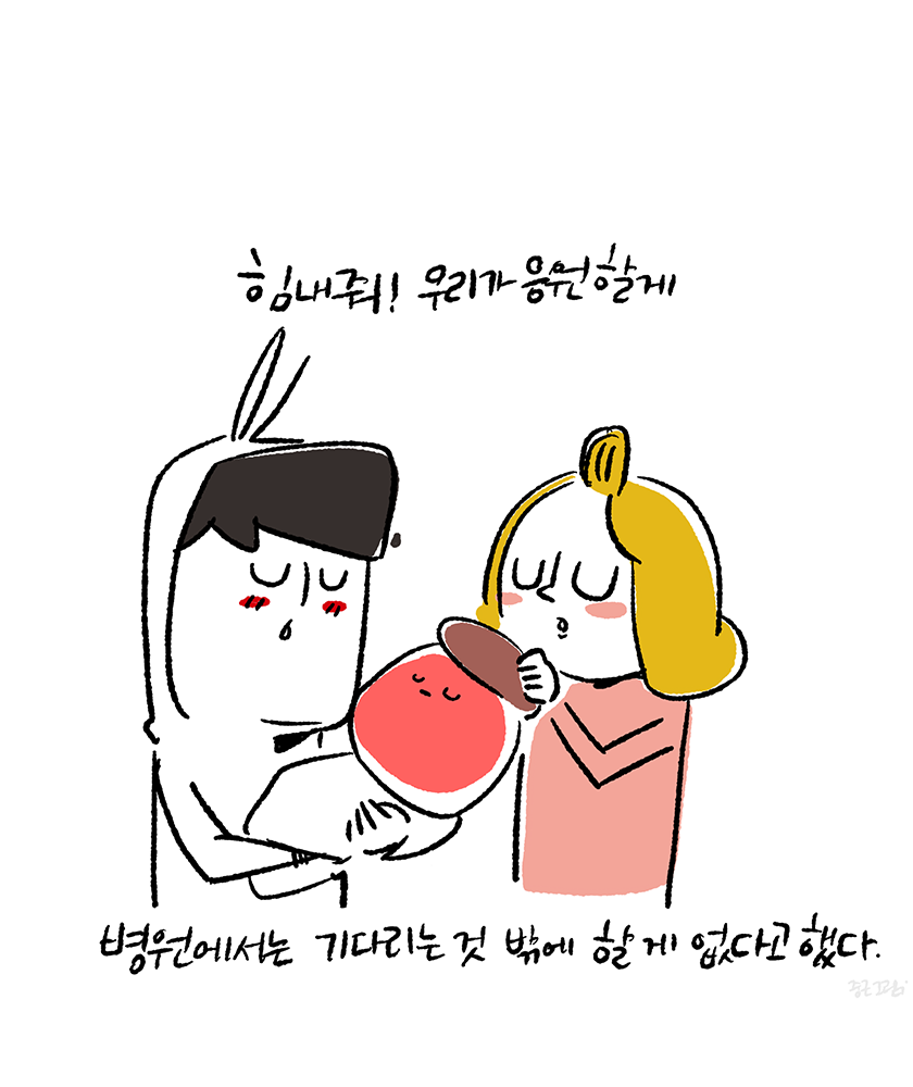 이때까지도 아이는 이름이 없어 '엄마의 아이'라는 이름으로 다음 예약을 했다 3개월 뒤 그러니까 100일 즈음이 되겠네... 진료를 모두 마치고 조금은 무겁고 적막한 기운을 가지고 조리원으로 돌아가는 길이 어찌나 어둡게 느껴졌는지 모르겠다. 괜찮을꺼라고 계속해서 말씀해주시는 장모님 덕분에 좀 위로가 되기도 하고 힘을 내볼 수 있었다. 이제 아빠와 엄마는 그저 본연의 역할을 다하며 너를 응원해 줄 수 밖에 없으니 그 기운을 알아채주면 좋겠구나. 많이 먹고 많이 싸고 잘 자고 잘 울고 힘내길 바래본다.