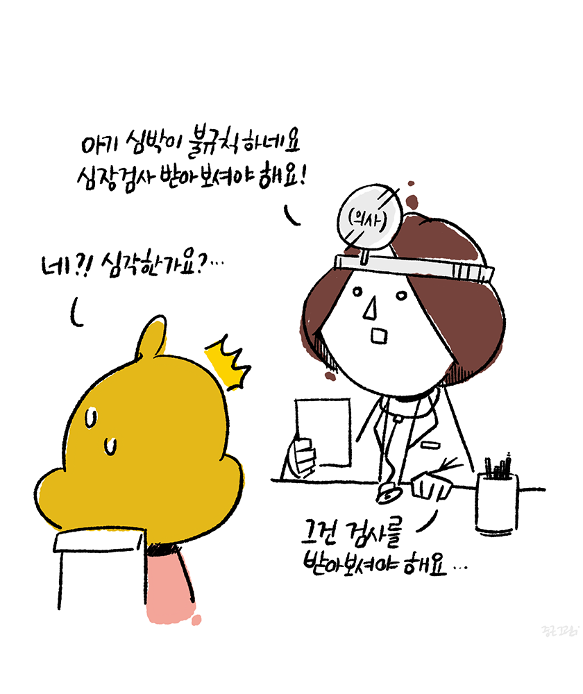 의사를 만나기 전에 접수부터 초음파 검사, 심전도 검사를 해야했고 코로나 시국이라 혼자만 마스크를 쓰고 있지 않는 아기가 그런 부분에서도 걱정이 됐다. 작은 몸에 이런 저런 기기를 대어보고 부착하니 아기는 더 작아 보였다. 생각해보니 나도 안해본 심전도 검사가 아닌가. 싫은 내색은 하지만 막 울거나 하진 않았다. 기특하게도 부모의 걱정을 살짝 덜어주려고 그랬나 싶었다. 검사를 마시고 의사의 소견이 나올 때까지 또 긴장하며 시간을 보냈다.