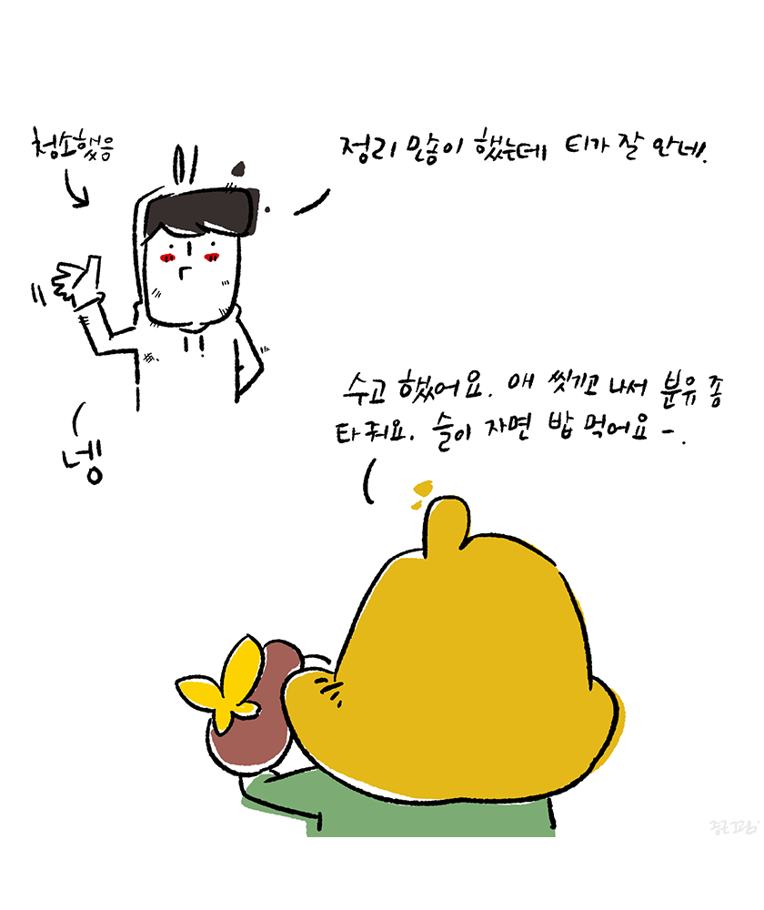 그 이후에 생긴 우리 가족의 규칙은 분유포트 세척 또는 물을 끓일 경우 기기에 아빠의 그림을 올려놓는 것이다.