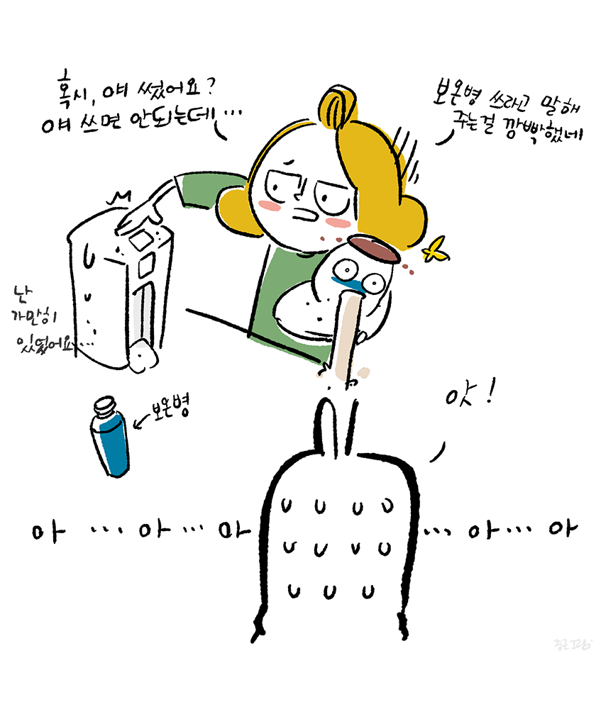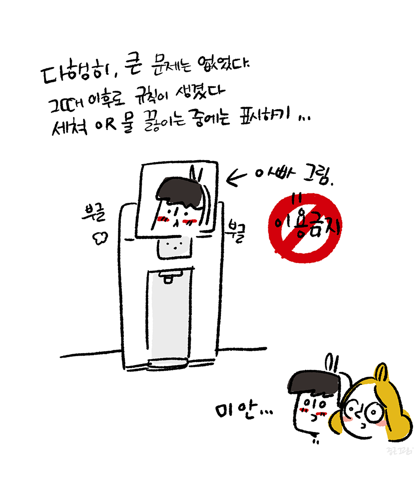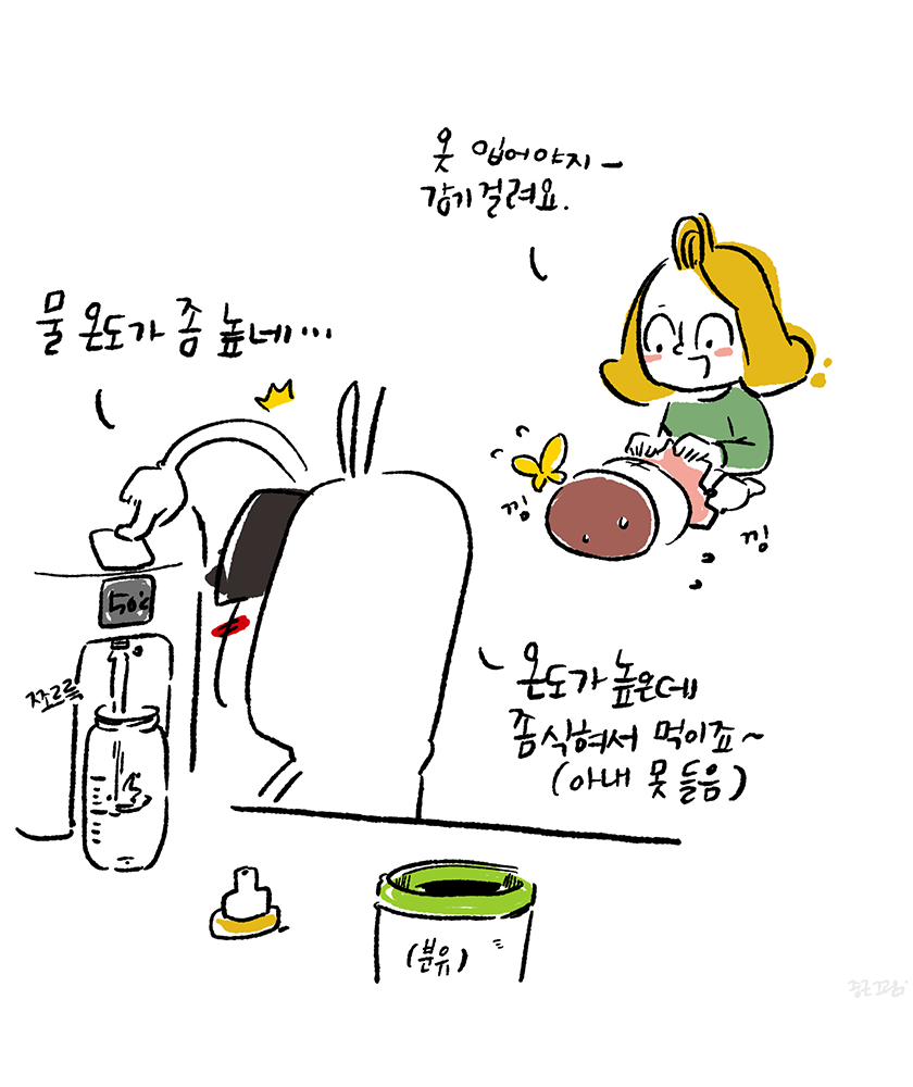 그 이후에 생긴 우리 가족의 규칙은 분유포트 세척 또는 물을 끓일 경우 기기에 아빠의 그림을 올려놓는 것이다.