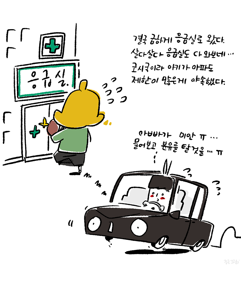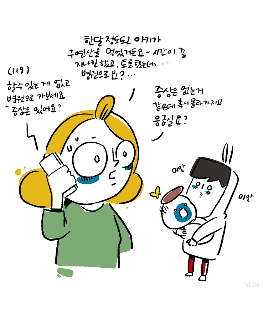그렇게 생후 38일만에 응급실에 가게 된 슬이는 코시국이라 혼자서만 의사를 만나러 갔다. 시간이 얼마나 흘렀을까 아내가 들어가서 딸을 데리고 나왔다. 진찰 결과 이미 섭취한 시간이 꽤 흘러서 해줄 것이 딱히 없다. 특별하게 문제 되지는 않을 것이니 앞으로는 특별히 조심해주길 바란다. 아내는 너무 속상하고 무서워 했다.