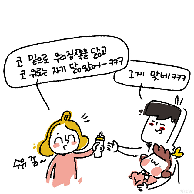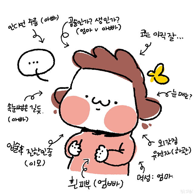 우리 집에서는 나의 애기 때 모습을 알고 있고, 아내의 집에서는 아내의 애기 때 모습을 기억하고 있기 때문에 양가에서는 각각 '우리 아들을 닮았네~', '우리 딸을 닮았네~' 이렇게 말했다. 신기하게 그도 그럴 것이 아내의 애기 때 사진이나 나의 애기 때 사진을 보면 서로 닮지 않았지만 딸을 보고 나면 둘의 얼굴이 모두 닮긴 했다.