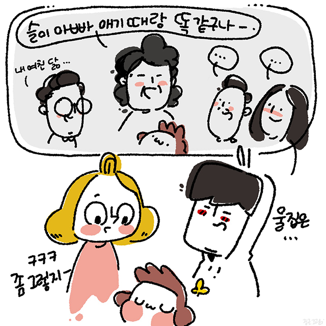 어느날은 내가 보이기도 하고 아내가 보이기도 하고 엄마가 보이기도 하고 장인 장모님이 보이기도 했다. 내 동생들과 아내의 동생들의 얼굴이 보이기도 했고 심지어는 내 외할머니의 얼굴이 보일 때가 있어서 흠칫 놀라기도 하고 유전자라는 게 이렇게 무서울 수 있구나 라는 생각마저 들었다.
