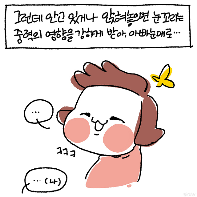 나와 아내의 눈매는 생김새가 완전 반대인데 아내는 눈꼬리가 올라간 눈매를 가졌다면 나는 항상 졸린 듯한 처진 눈매를 가지고 있기 때문에 딸의 눈매는 과연 어떻게 될까 내심 궁금했었다. 딸은 처음에 내 눈매에 아내의 속눈썹을 가진 듯 했는데 시간이 조금씩 흐르면서 내 눈매와 아내의 눈매를 모두 가지는 것을 알 수 있었다. 보통 때 앉아 있거나 안고 있을 때 눈꼬리는 중력 방향을 처지면서 내 눈매를 닮은 것을 볼 수 있었다. 아기가 눈을 감고 있거나 누워있게 되면 신기하게도 눈매가 하늘로 솟구쳐 올라가면서 엄마 눈매를 닮게 되는 것을 보고는 참 신기했다. 보너스로 아기는 내 속눈썹을 유전자는 잘 챙겼는지 속눈썹이 점점 길어지더니 이제는 엄마보다 길어질 것 같은 확신이 들었다.