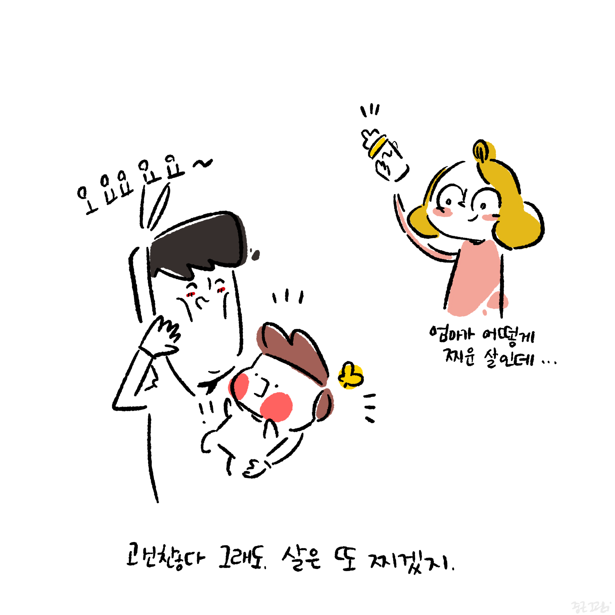 엄마가 어떻게 찌운 살인데... 하는 아내의 소회와 실망감 섞인 목소리에서 걱정이 느껴졌다. 나는 그 무게를 온전히 너에게 전달한 것일까? 2개월이 좀 지난 시점 아빠가 빠진 무게만큼 아기의 몸무게가 늘었다. 세상에 태어나 모든 게 새롭고 낯설을 슬이는 잘 먹고 잘 싸고 잘 지내는데 아빠는 육아가 처음이라는 이유로 꺼칠해졌다. 새벽에 일어나서 수유 한 번 하고 낮동안 놀아주고 같이 멍때리고 기저귀 갈아주고 이렇게 저렇게 아이랑 시간을 보내다보면 밥 먹을 생각을 못하게 되고 딱히 배가 고프지도 않았다. 그러는 중 아내가 주는 커피는 가뭄에 단비 같았다. 커피만 마셔도 충분했다. 아기에 대해서 신경을 많이 쓰고 울기라도 하면 멘탈이 요동을 쳤다. 더불어 다른 곳에서 받는 스트레스도 있어서 그런지 딱히 밥맛은 없고 식사량도 딱 죽지 않을 만큼만 하게 됐다. 그것이 체중감량에 도움(?)을 주었다. 장모님도 아내도 주변에서 나를 봤던 사람들은 살빠진 거 아니냐는 말을 참 많이 했다. 실제로 그 눈들은 정확했고 살이 빠지면 얼굴부터 빠지는 나는 그렇게 힘들지 않았는데 엄청 힘든 사람인 듯, 힘든 티를 내는 사람처럼 보였을 것이라 생각했다. 사람들이 생각하는 것보다는 덜 힘들었는데... 그렇게 육아도 질량보존의 법칙이 적용이 되는 순간이 한동안 지속 됐다. 더 살이 빠졌다는 것이다. 하지만 지금은 출근하고 간식도 먹고 야식도 먹고 하니까. 다이어트를 하지 않았는데도 요요현상이 와버렸다. 살은 또 찌겠지 했던 것은 생각보다 일찍 내 뱃살로 붙어버렸다.