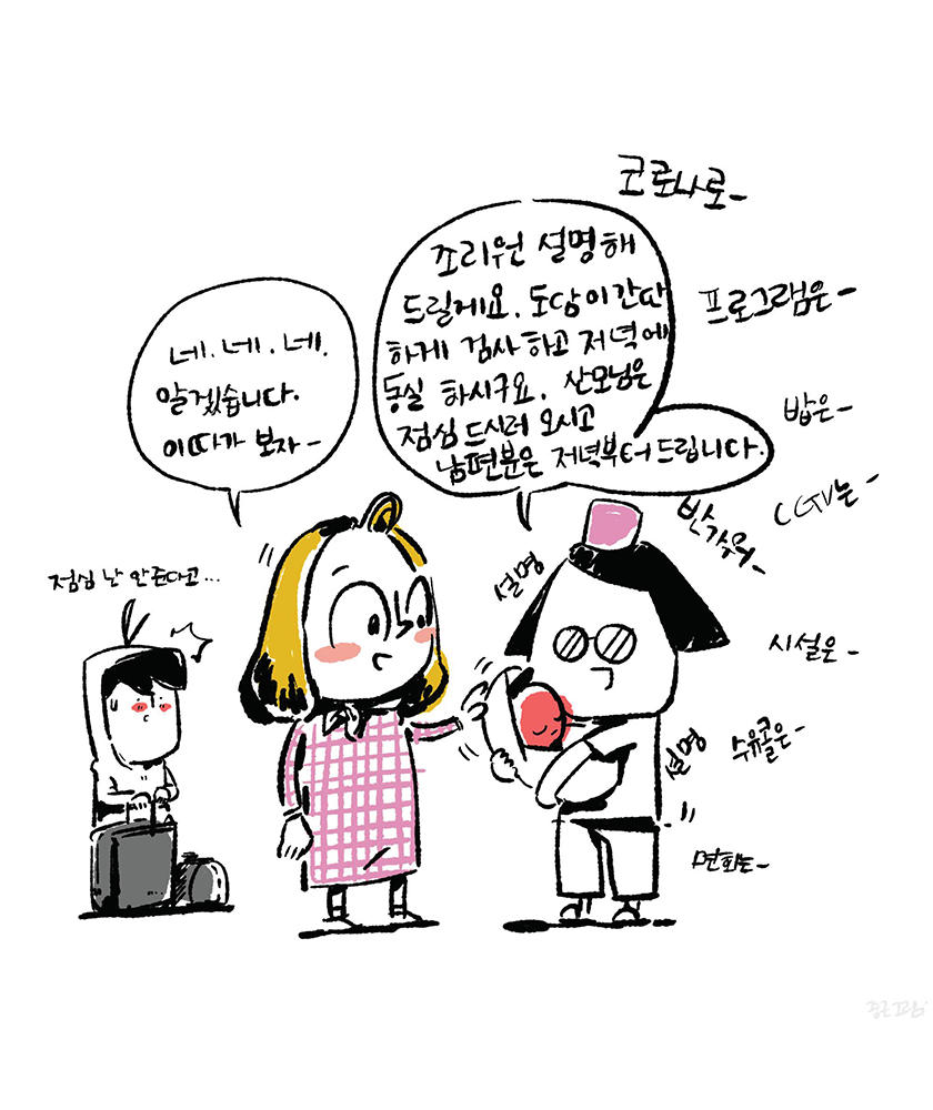 딸이 지낼 곳으로 이동해야 하는 날은 비가 내렸다. 태어난 지 3일 만에 첫 비를 마주한 아기, 그게 걱정되는 부모. 코시국이라 외출마저 제한된 산부인과에서 이틀을 보내고 조리원으로 이동해야 했다. 처음에 예약했던 조리원은 갑작스레 몰려온 산모들로 인해 며칠을 대기했다가 오라고 해서 다른 조리원으로 옮겼다. 조리원에서는 보호자 첫끼를 주지 않는데서 입실 전에 부리나케 햄버거를 사 왔다. 햄버거는 나의 애착 음식 같은 것이니까 불만은 전혀 없다. 오히려 좋다. 조리원으로 넘어와서 며칠 만에 씻는 것도 좋았고 좀 쾌적하게 쉰다는 생각에 이곳은 아빠에게도 좋은 곳이라고 생각했다. 좀 심심한 거 빼면... 아기는 면회 시간에 방으로 왔고 그 이외에는 유리 창 너머로만 볼 수 있었다. 첫 면회 와서 속싸개 싸는 것부터 안아주는 법 등을 배웠는데 너무 작아서 감히 손대기 어려웠다. 기저귀 가는 방법도 이때 배웠는데 할 수 있겠다는 자신감은 어디서 생겼는지 당연히 잘 해낼 수 있다고 생각했다. 면회 중 똥을 싸버린 아기를 어떻게 해야할지 몰라서 도움을 요청했고, 선생님께서 설명해주시며 뒤처리 하는 방법을 슬쩍 보고는 또 해낼 수 있다고 생각했다. 그렇지만 생각과 실전은 차이가 큰 법이라. 막상 똥을 싼 아기를 다시 볼 때는 안절부절못하며 손을 못 대는 나를 대신해 아내가 처리해주었다. 그때 어깨 너머로 또 익혔다.