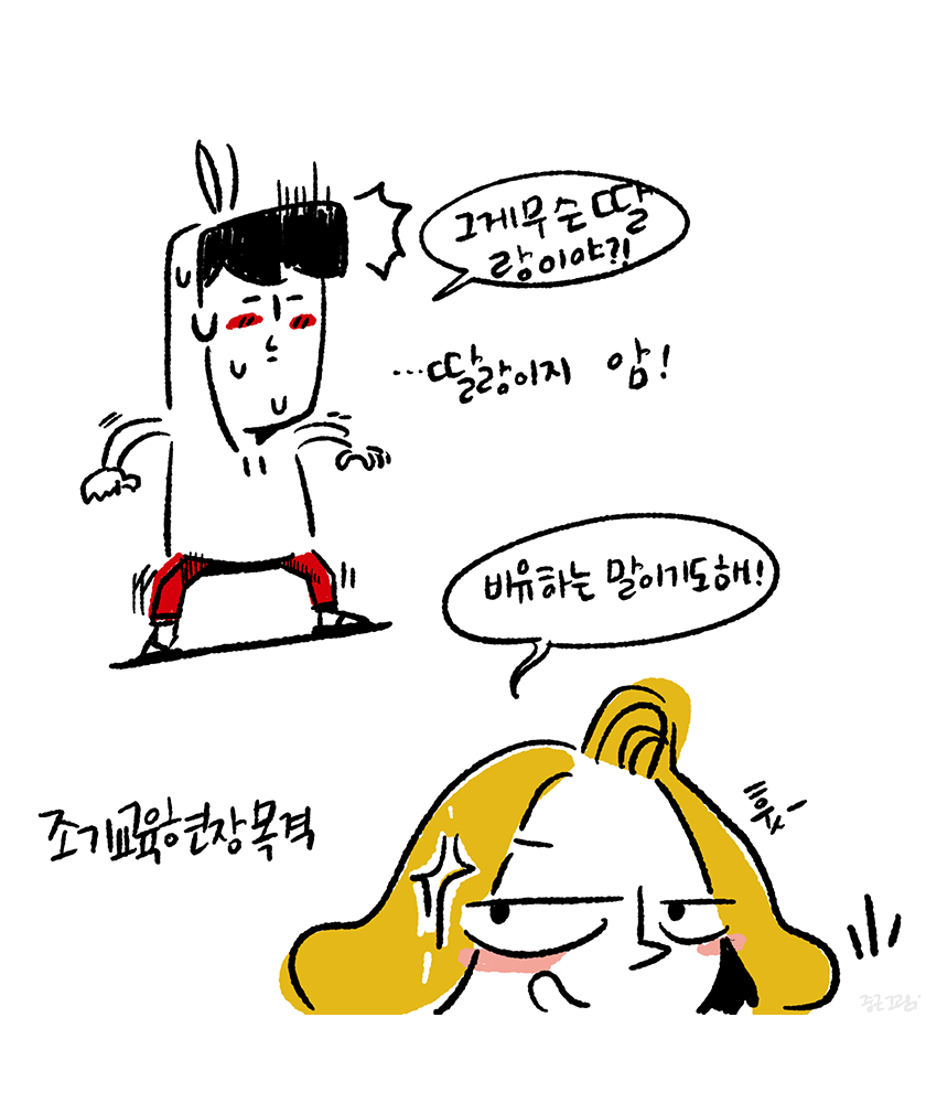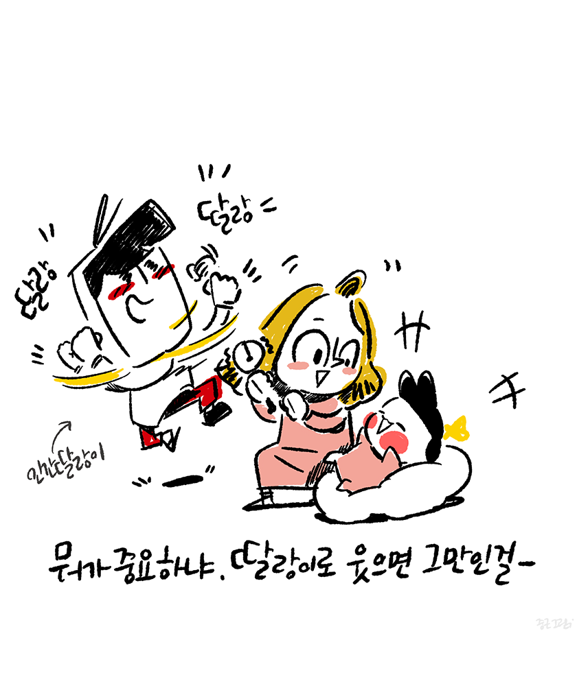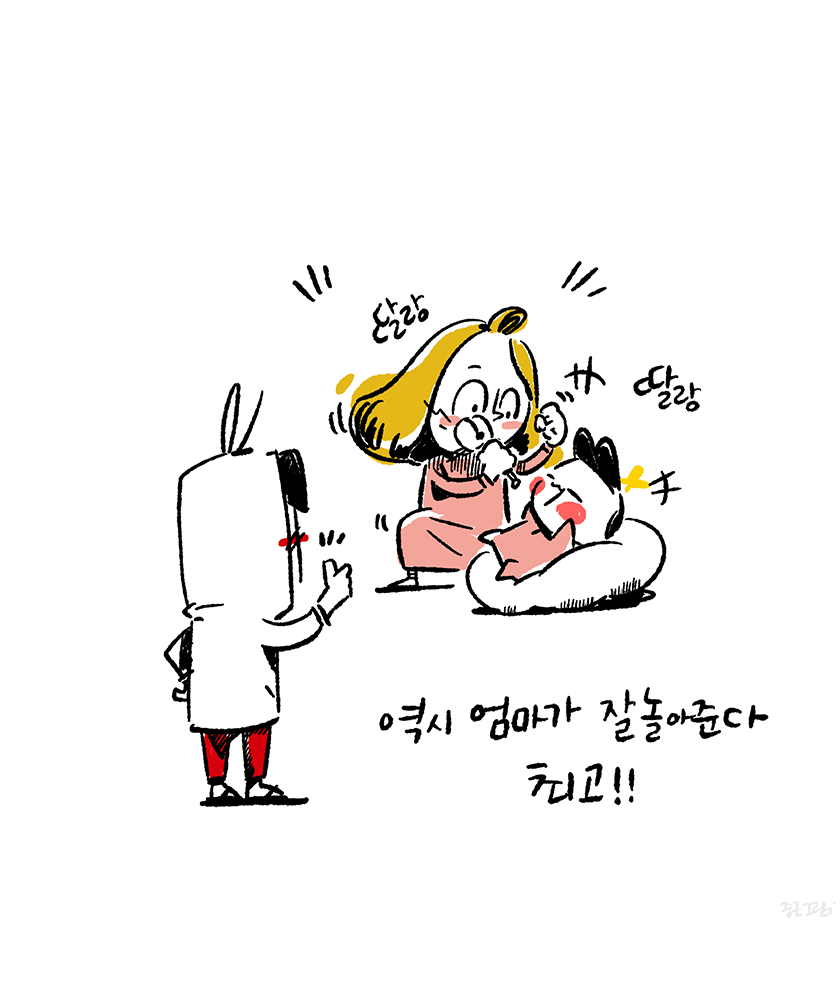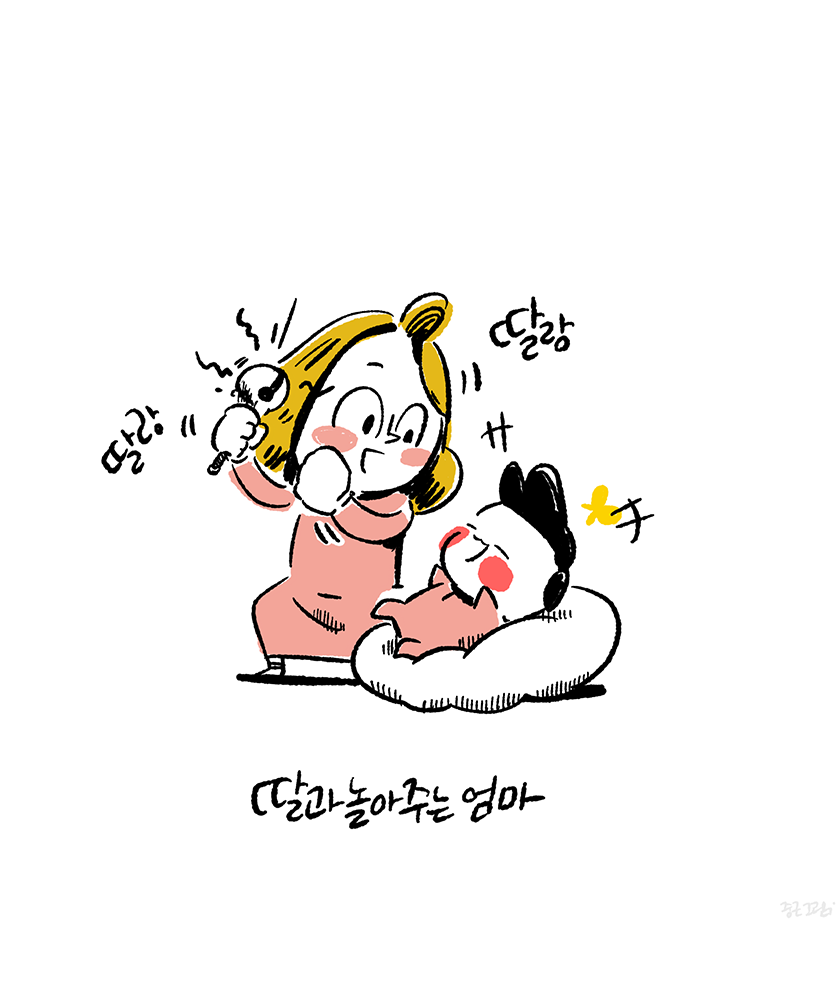 아기가 칭얼대면 어떻게든 기분을 풀어주려고 부모들은 노력하기 마련인 듯 하다. 또 아기의 웃는 얼굴 한 번 보기 위해서 엄청 재롱을 떨게 된다. 지인으로부터 받은 출산 선물, 딸랑이 세트. 딸랑딸랑~ 아이 눈 앞에서 흔들면 움직임을 인직하는 것인지 소리에 홀리는 것인지 쳐다보고 정신을 뺏겨 칭얼거리던 것을 까먹는 것 같다. 이 날은 심심해 보이는 딸을 위해 아내가 딸랑이 장난감을 가지고 아이랑 놀아주는 모습을 목격했다. 흐뭇하게 바라보고 있다보니 귀여운 포인트가 있어서 이렇게 기록으로 남기게 되었다. 이렇게 어린 아이에게 세상은 이렇단다라는 조기교육의 현장을 봐버린 것이다. 웃음이 나오면서도 틀린 말은 아니기에 웃으며 그 귀여운 장면을 즐겼다. 딸랑이 아부를 잘하는 사람을 비유하는 말이긴 하지 좀 오랜만에 듣는 표현이기도 했다. 어떻게 보면 엄마 아빠는 아이에게 웃는 얼굴을 보기 위해서 아부를 하고 있는 것은 아닌지, 그런 생각이 들었다. 딸! 딸랑따랑~