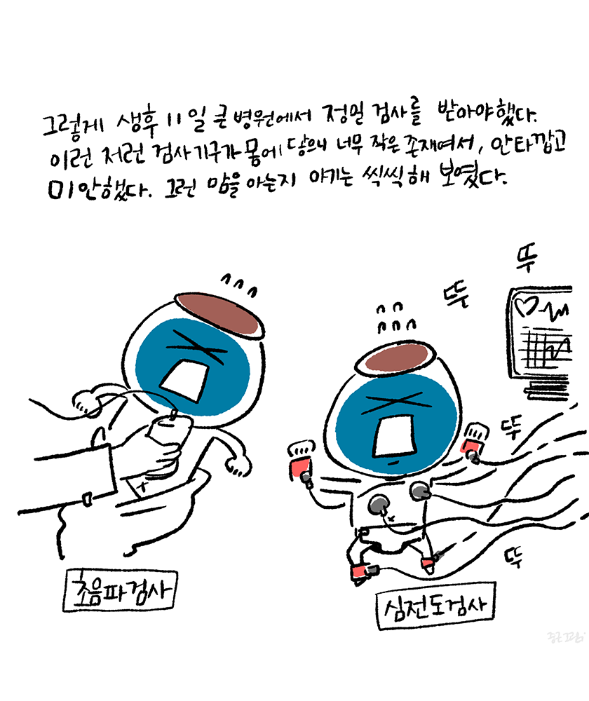 의사를 만나기 전에 접수부터 초음파 검사, 심전도 검사를 해야했고 코로나 시국이라 혼자만 마스크를 쓰고 있지 않는 아기가 그런 부분에서도 걱정이 됐다. 작은 몸에 이런 저런 기기를 대어보고 부착하니 아기는 더 작아 보였다. 생각해보니 나도 안해본 심전도 검사가 아닌가. 싫은 내색은 하지만 막 울거나 하진 않았다. 기특하게도 부모의 걱정을 살짝 덜어주려고 그랬나 싶었다. 검사를 마시고 의사의 소견이 나올 때까지 또 긴장하며 시간을 보냈다.