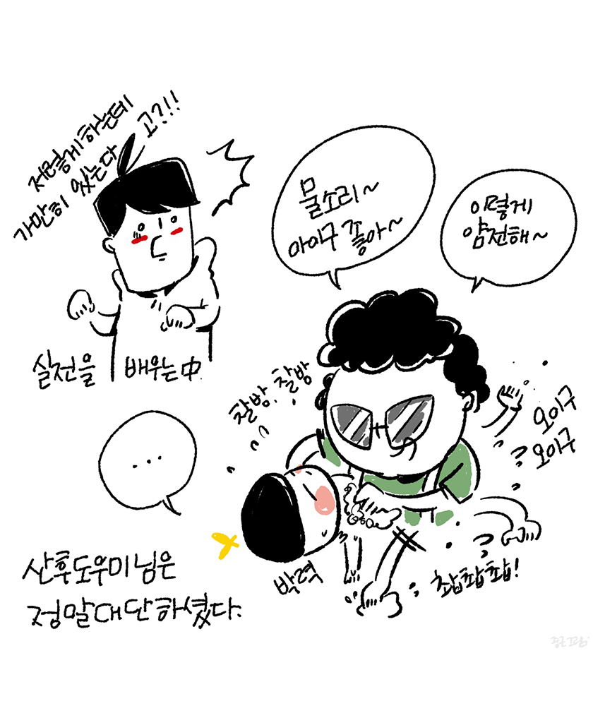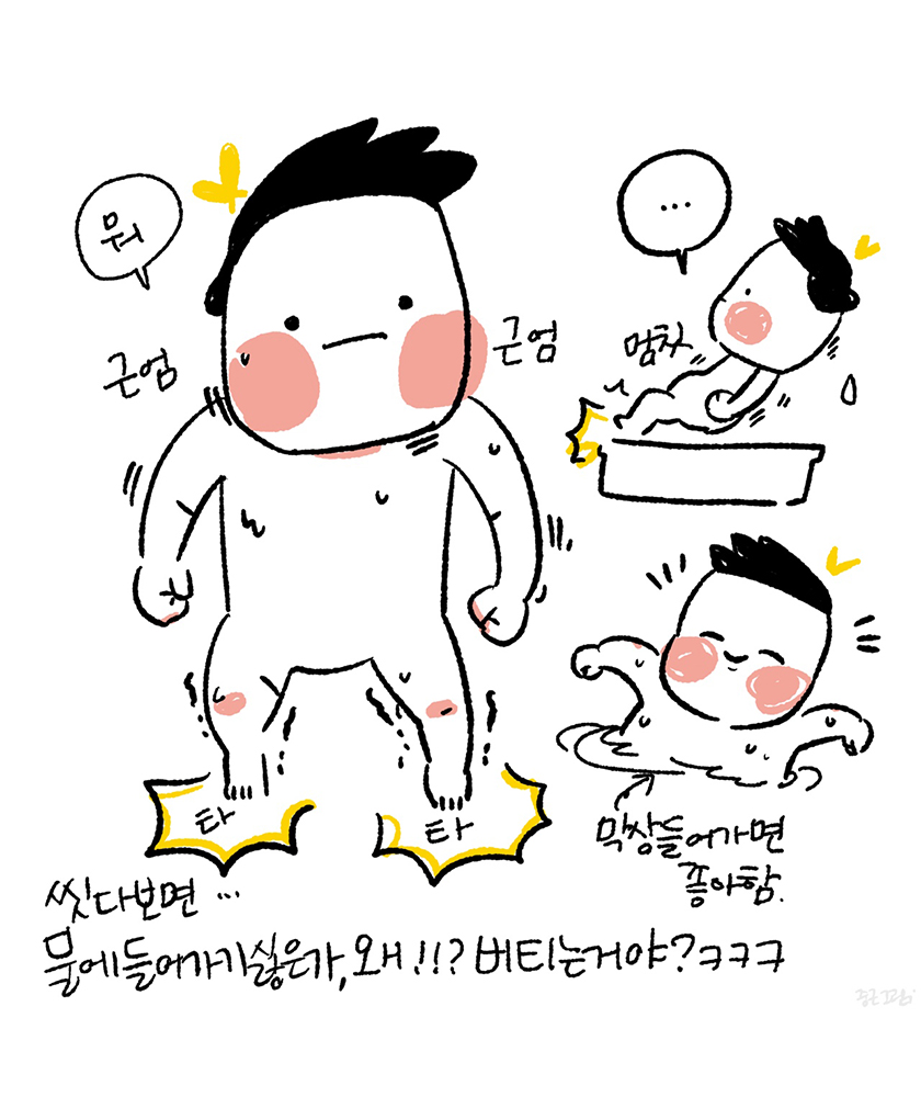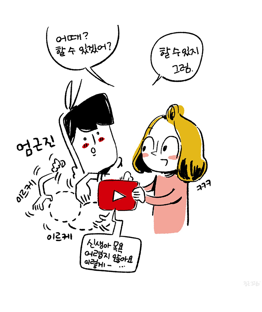 아내가 조리원에서 나오면서부터는 아기를 씻기는 일을 해보기로 했다. 유튜브를 보며 몸과 마음의 준비를 했다. 막상 아기를 씻기려고 하니 묘하게 무섭기도 하고 긴장이 되기도 했다. 게다가 촬영까지 당했다. 신기하게도 처음 씻기는 날에는 아기가 뭘 몰라서 그런 것인지 처음 겪는 손길이라 당황한 것인지 실제로 편했던 것인지 울지 않았다. 그래서 씻기고 나서 스스로를 기특해 하며 뿌듯한 맘으로 내 새로운 재능을 찾은 것일까? 생각도 하게 되었지만 그다음 날부터 목욕이 호락호락하지 않다는 것을 울음으로 알려주는 우리 딸. 그렇게 우여곡절의 2주를 지나 처가댁에서 집으로 돌아왔을 때는 산후도우미 이모님이 오셨다. 도우미 이모님께 목욕에 대해서 질문을 드렸더니 보여주시겠다며 본인의 목욕실력을 뽐내셨다. 뭔가 거친 듯 섬세한 손길 거침없이 아기를 씻기는 것을 보고 아기들은 생각보다 강한 건가 라는 생각마저 들 정도였다. 이모님은 제다이란 말인가... 그것도 배웠다고 나름 자신감을 얻어 다음 날 목욕을 시도했을 때는 어김없이 불편함을 표현하는 딸이었다. 그렇게 서로의 합(?)을 맞추는 시간을 보내고 어느 순간부터는 어디를 씻기는지 아는지 도와주는 느낌이 들 정도가 되었다고 착각했다. 아기가 성장하면서 나도 스킬이 늘고 점점 편해지고 있다.