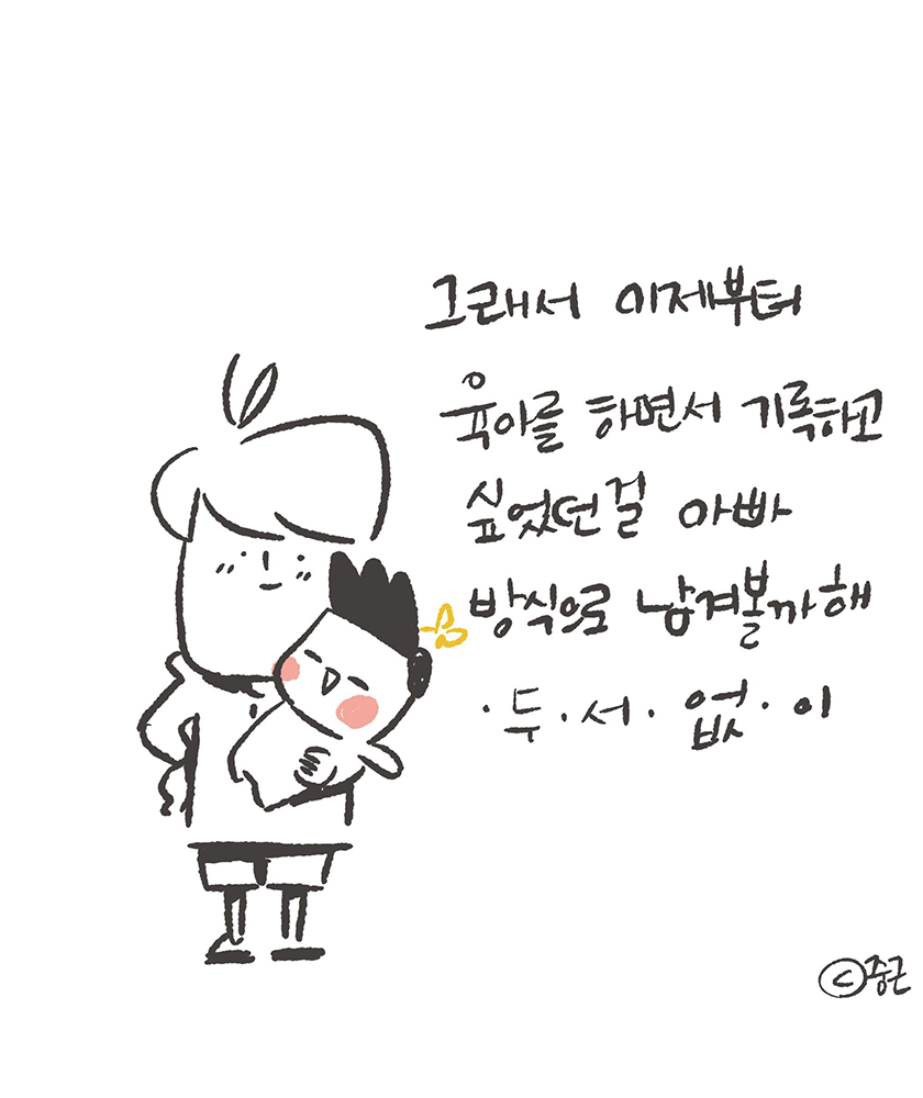 절대로 길지 않은 육아휴직을 끝내려다 보니 이런 생각이 문득 들었다. 뭔가 남겨줄 만한 것이 있을까? 매 순간순간 울고 웃으며 육아했던 나와 아내 그리고 그 속에서 생존해야했던 우리 아기. 낙서를 일삼는 사람이 뭘 해줄까 싶어 낙서를 해주기로 했다. 남들 말하는 육아일기 같은 것 말이다. 나를 위해서 너를 위해서 그리고 우리를 위해서! 아이가 태어나고 산부인과에서 3일, 조리원에서 2주, 네 외갓집에서 2주, 산후조리 도우미 이모님과 2주 그리고 나, 아빠의 차례가 왔다. 더 길게 육아 휴직을 해보고 싶었지만 나는 작은 회사를 다니고 있기에 회사 방침에 따라 한달의 시간만 가질 수 있었다. 새벽 마다 엄마와 교대로 잠에서 일어나 새벽 수유 등 아기를 돌봤고, 여러가지 검사와 회복을 위해 병원을 다녀야하는 엄마를 대신해 낮동안 슬이와 단둘이 시간을 보냈다. 낮에 아이를 보는 일이 생각보다 너무 어려웠고 감정적으로도 힘들었다. 분명 이유가 있어서 울었겠지만 초보 아빠는 육아모드 기어를 당황과 긴장에 박아 놓고 있다보니 서툴기 그지 없었다. 그러는 너에게 짜증내고 바로 또 후회하고 달래고 네가 잠든 사이 왜 우는지 어떻게 달래는지 뭘 해야하는지 공부를 하게 되었고 그렇게 너무 작은 딸아이는 서툰 아빠의 실습 대상이었다. 아빠는 공대생이라 프로그래밍이 대로 뭔가 진행되어야 스트레스가 적은데 육아는 다른 차원이어서 반성을 정말 많이 한 시간이었다. 게다가 이 기간동안 아내를 위해 해줄 수 있는게 뭘까? 생각한 끝에 한달이라는 짧은 시간이지만 이 어린 녀석을 데리고 수면 교육이라는 것을 해보자였고 그 과정은 험난했지만 결과는 80점 정도 줄 수 있었다. 너무 힘들어 며칠은 너를 재워놓고 여러가지 수면 교육에 대해서 공부해봤다. (딸이 태어나기 전에 우리 부부는 아이의 행동 중 닮은 쪽에서 그것에 대해 책임지자고 했었기에 잠을 잘 안 자는 것은 나를 닮은 것이므로 내가 책임져 보기로 한 것.) 결국 우리에게 맞는 수면 교육법을 찾은 것인지, 이런 아빠가 가엾고 기특해서 맞춰주는 것인지는 나중에 딸이 알려줬으면 좋겠다. 육아휴직 막바지에 지쳐있는 나에게 지인들의 연락은 잠든 낙서장이를 깨우는 경종 같은 것이었다. 솔직히 육아휴직 중에 육아하면서 쉬엄쉬엄 낙서도 하고 만화도 그려야지 했는데, 돌아보니 너무 건방진 생각이었다. 그렇게 시작하게 된 슬이야기 과연 내가 어디까지 꾸준히 할 수 있을지 ... 그리고 육아휴직 아빠들 꼭 했으면 한다. 소중하다.