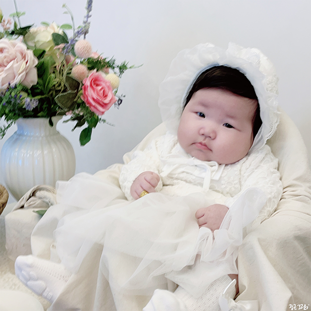 백일 전날 밤에 백일상과 한복이 택배로 왔었고 당일에 우리는 아침부터 공간을 비우고 상을 차리고 소품들을 이리 놓고 저리 놓고 떡도 놓아보고 의자자리는 어떻게할지 슬이를 미리 앉혀보기도 하고 분주하게 시간을 보냈다. 행사 준비가 완료되고 오늘의 주인공인 슬이를 자리에 앉혀놓고 보니 뭔가 감회가 새로웠다.