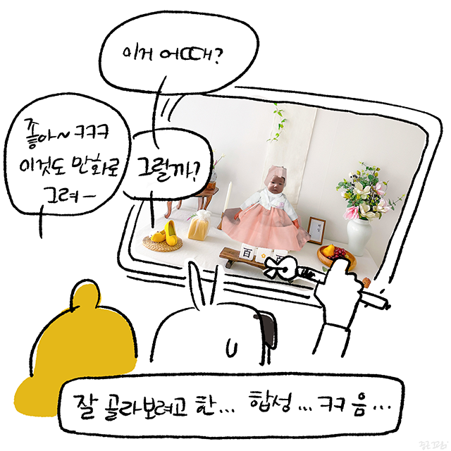 백일상을 좀 골라보고 그에 어울릴만한 아기용 한복까지 같이 봤다. 여러 개의 백일상과 여러 벌의 선택지는 나를 선택장애로 이끌었고 무엇을 선택해도 아쉬움이 좀 남을 것 같았다. 그래서 소거 하는 방식으로 하나씩 하나씩 제거 하고 나니 그나마 맘에드는 스타일 몇개가 남았고 한복을 고르려고 보니 색깔을 선택해야하는 큰 문제가 남았다. 나는 태생이 색깔 고자 (색을 잘 못씀)이기 때문에 조악한 실력이지만 포토샵으로 슬이 얼굴을 슬쩍 합성해서 나름 열심히 고민하고 골라보기로 했다. 그리고 내가 원했던 한복과 아내가 원했던 한복을 입은 가상 공간에서 펼쳐지는 슬이의 패션쇼를 두어번 정도 보고 나서야 한복까지 골랐다. 개인적으로는 쨍한 느낌의 한복이 포인트가 될 것이라 생각했지만 실패했을 때는 입을 꾹 다물고 있어야 하기에 무난하면서 예쁜 것으로 고르기로 했다.